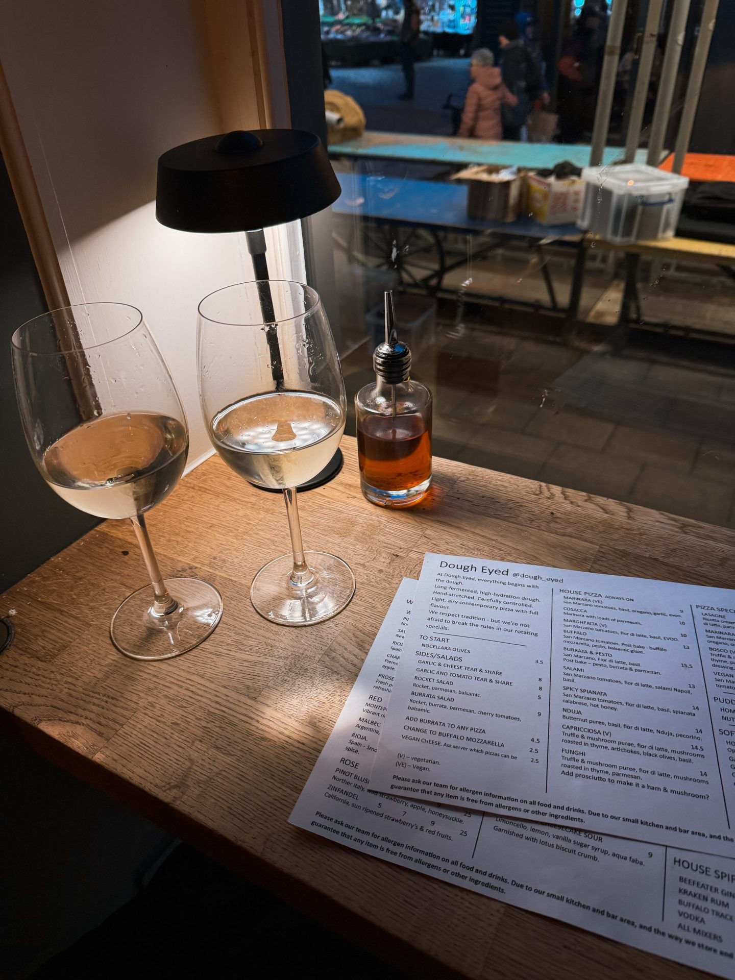 By this point, Beau was getting pretty tired, so we decided to take the pizza home instead. While we waited, we ordered two large glasses of wine — because it would’ve been rude not to, right? The wine was a solid 10/10, and the glasses were so good they’ve genuinely made me want to up my glassware game at home. There’s just something about a drink served in a beautiful glass that makes it taste even better — don’t you agree?