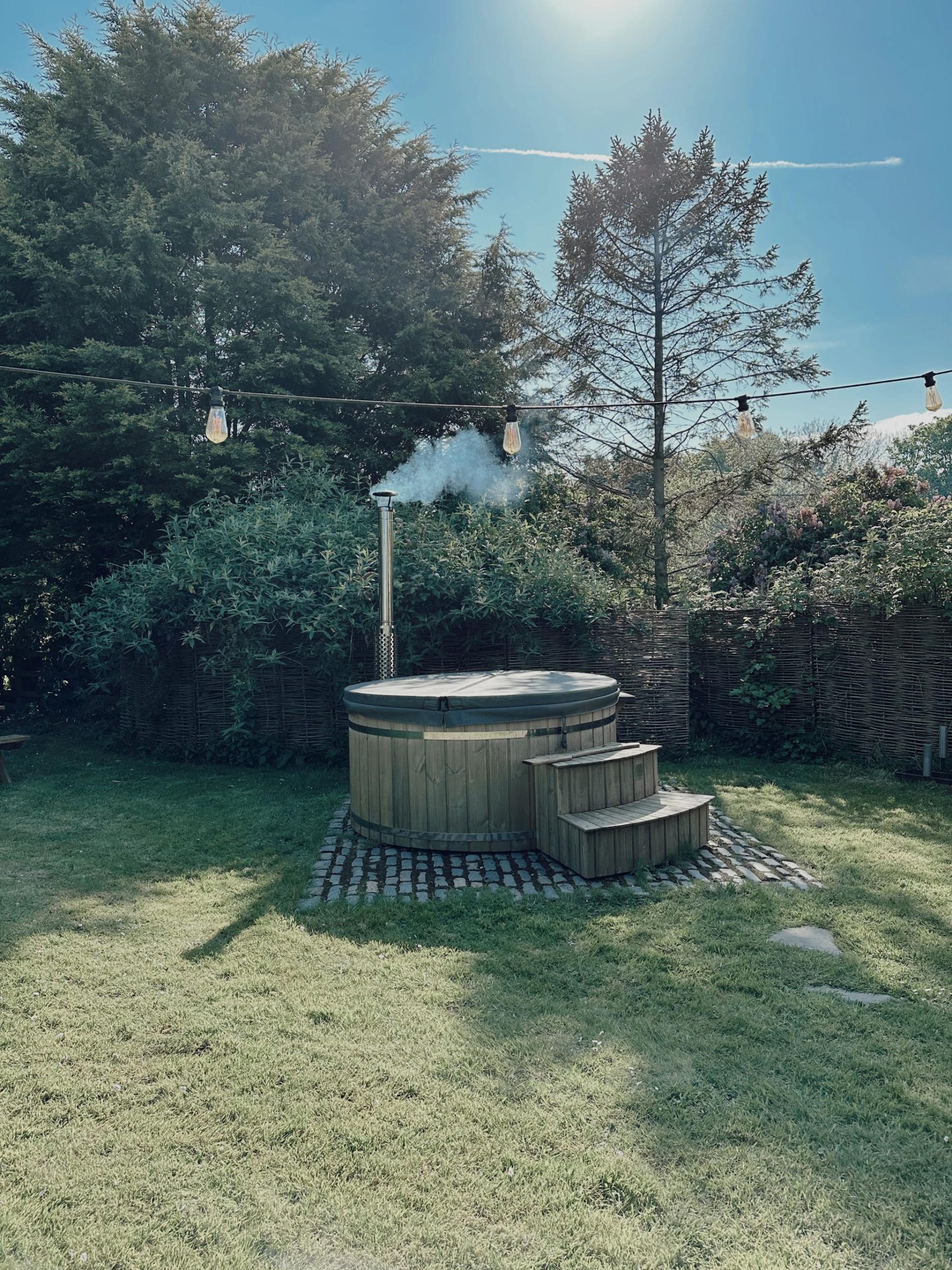 Starlight Hideaway offers a luxurious rustic retreat with a single shepherd hut, ensuring ultimate privacy and tranquillity. Constructed from top-notch English oak, the Hideaway seamlessly blends in with the lush greenery surrounding it. Upon arrival, we were greeted by three goats, including Vincent Van Gogh, which instantly captured our hearts. The hot tub was already being heated for us, thanks to the goats’ help!