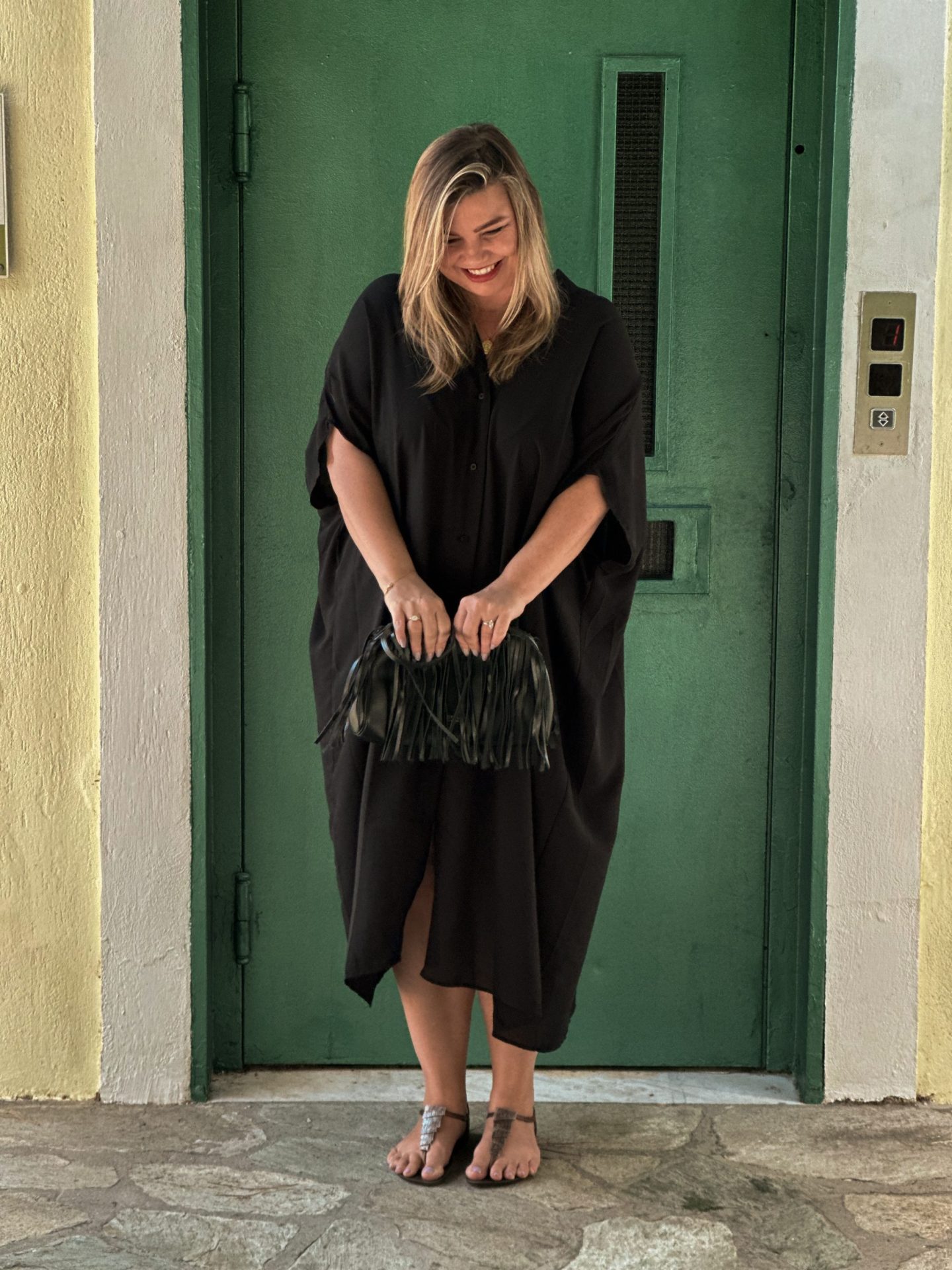 Fast forward to golden hour. You’ve swapped the sandals for sandals (very predictable for me :)) and slipped into a classic black kimono dress, as I have literally all been about the kimonos on this holiday. The Aria Bag still works perfectly — it’s sleek enough for dinner, but not too serious for holiday fun. Honestly, it’s the kind of bag that gets compliments from strangers and let me tell you, I got a lot.